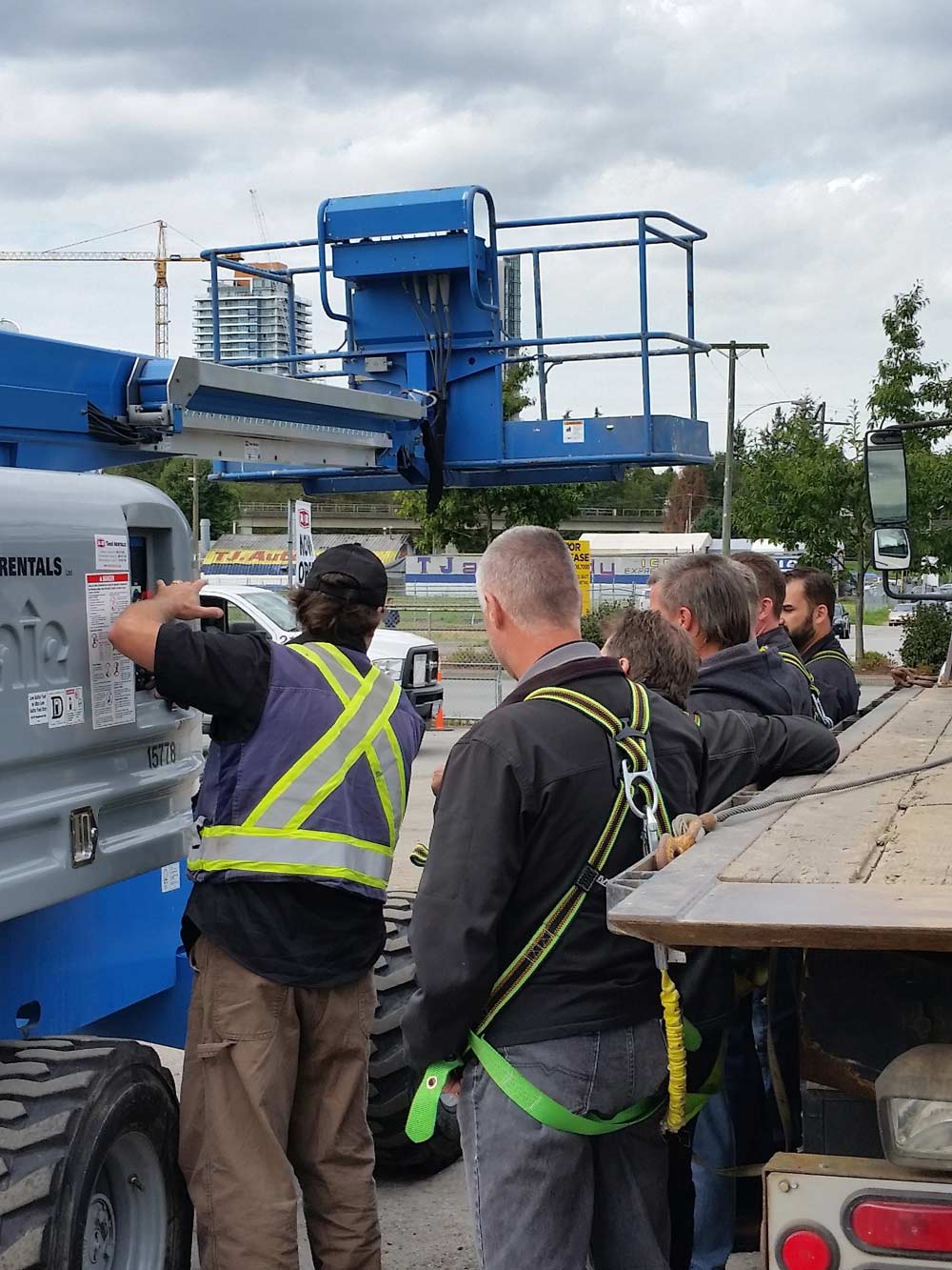 If you are afraid of heights, this may not be for you! Be prepared to go high up in the air to get comfortable with the sway of the machine at it’s highest. Your instructor will go over safety procedures and how to get down if you happen to get stuck up there. Also, identifying different hazards that surround you.